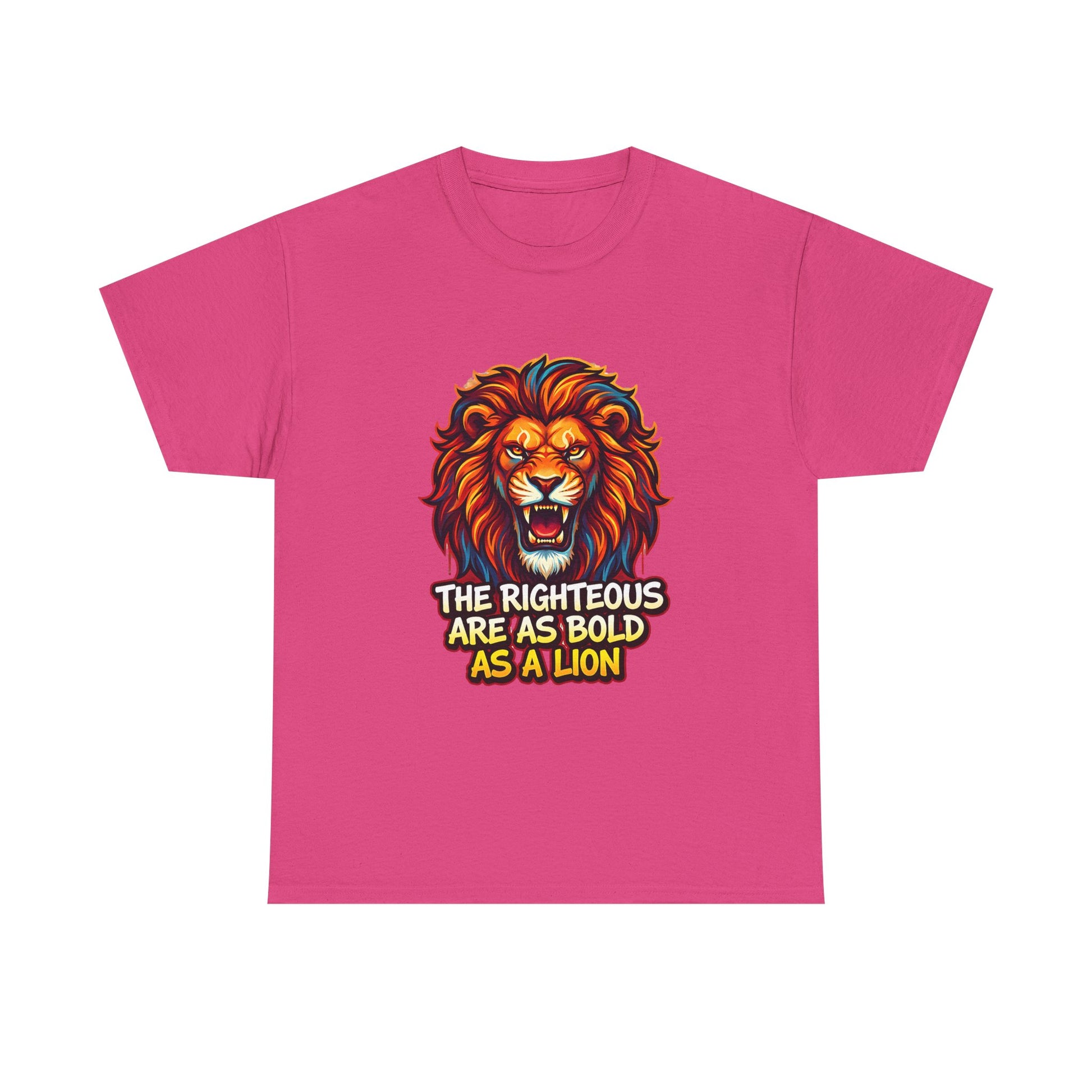 Wear courage on your chest. This classic crew tee features a vibrant, roaring lion illustration with the bold line “The righteous are as bold as a lion,” printed at the center. The artwork’s warm, saturated palette pops against the clean white canvas, giving the shirt an attitude that reads confident and uncompromising. Lightweight yet durable cotton keeps the feel breathable for everyday wear, while the tubular knit and ribbed collar hold their shape through repeat wear. It settles into casual routines — morning coffee, weekend meetups, volunteer shifts, or nights out — and becomes a quiet reminder to move through the day with conviction. The simple back keeps the focus on the front art, so the message comes through loud and clear.